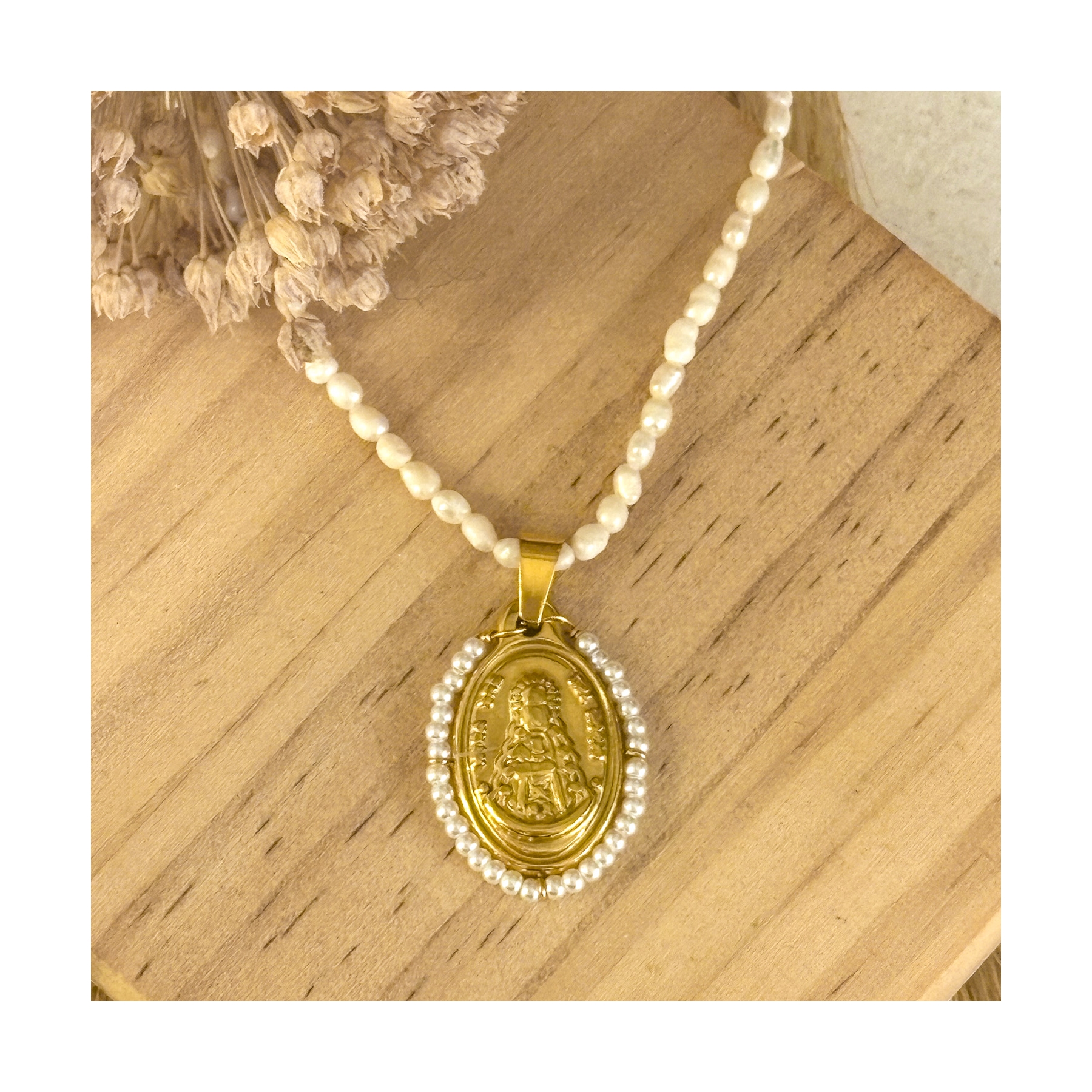 Gargantilla minibolitas nácar y medalla ovalada virgen del rocío