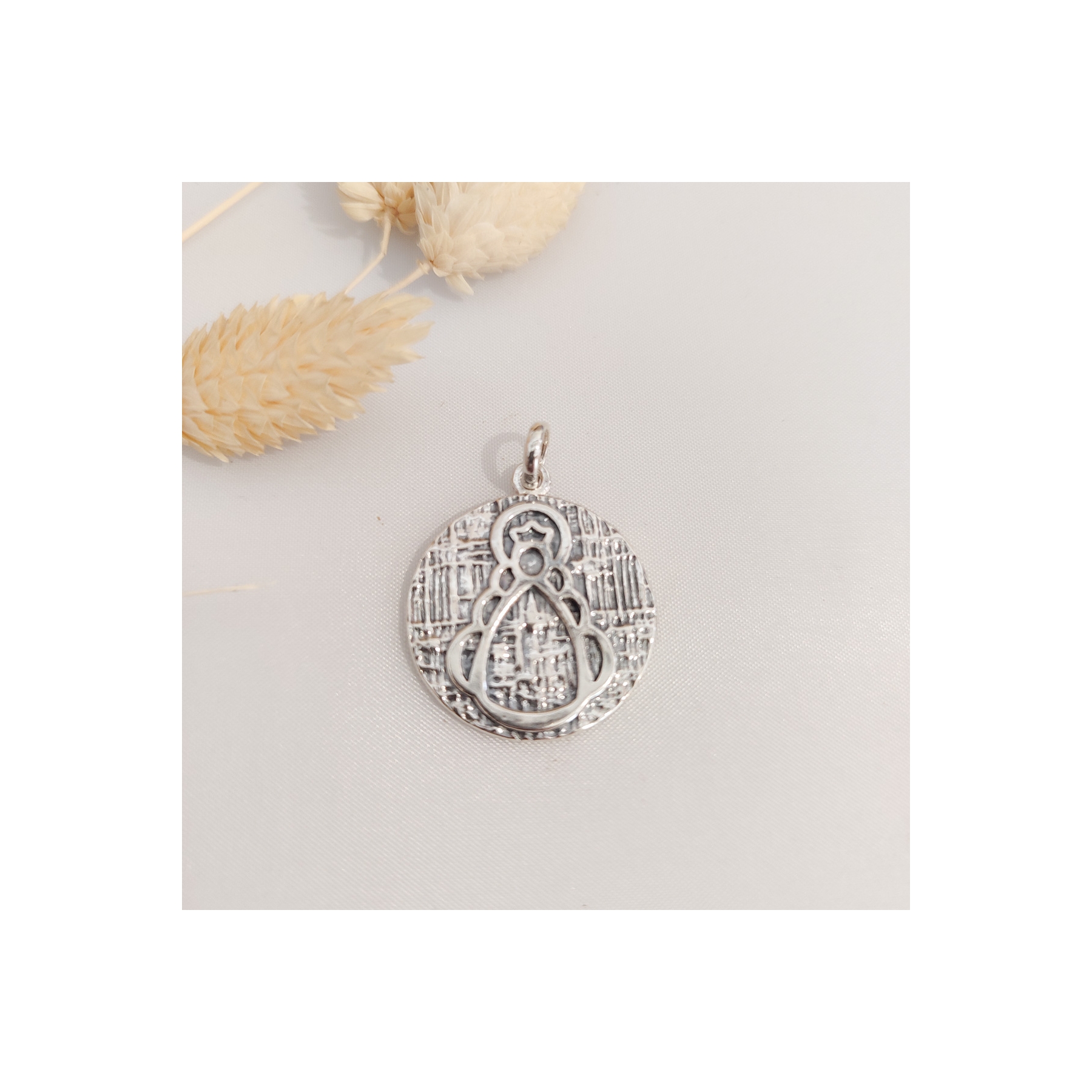 Medalla de plata redonda con relieve y en el centro Nuestra Silueta de la Virgen del Rocío.