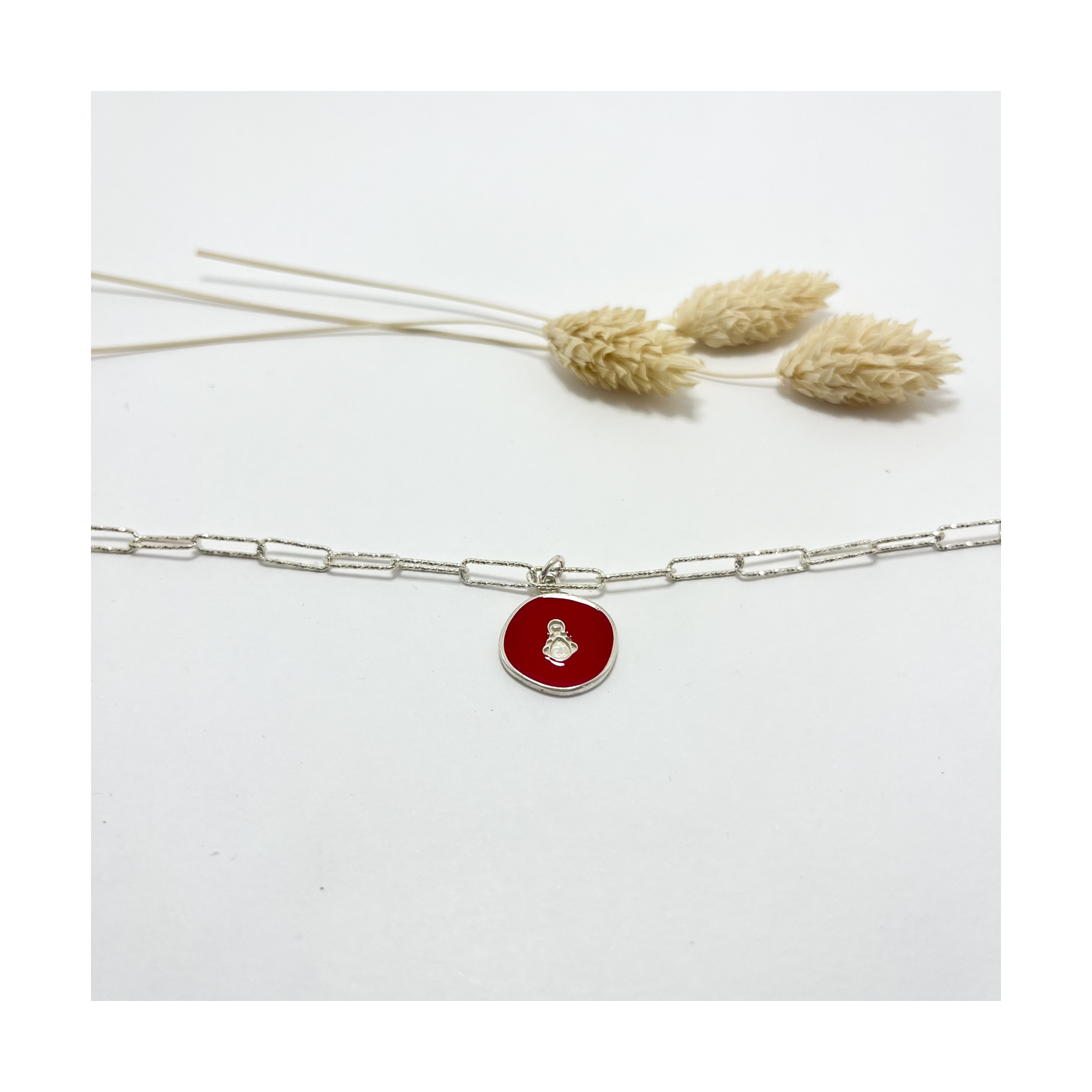 Pulsera de plata de ley con medalla de 2 cm colgando de una eslabón de la cadena esmaltada violeta y silueta virgen del Rocío. Cadena de plata con extra brillo, eslabones de 1 cm y un largo total de 20 cm; cierre de mosquetón.