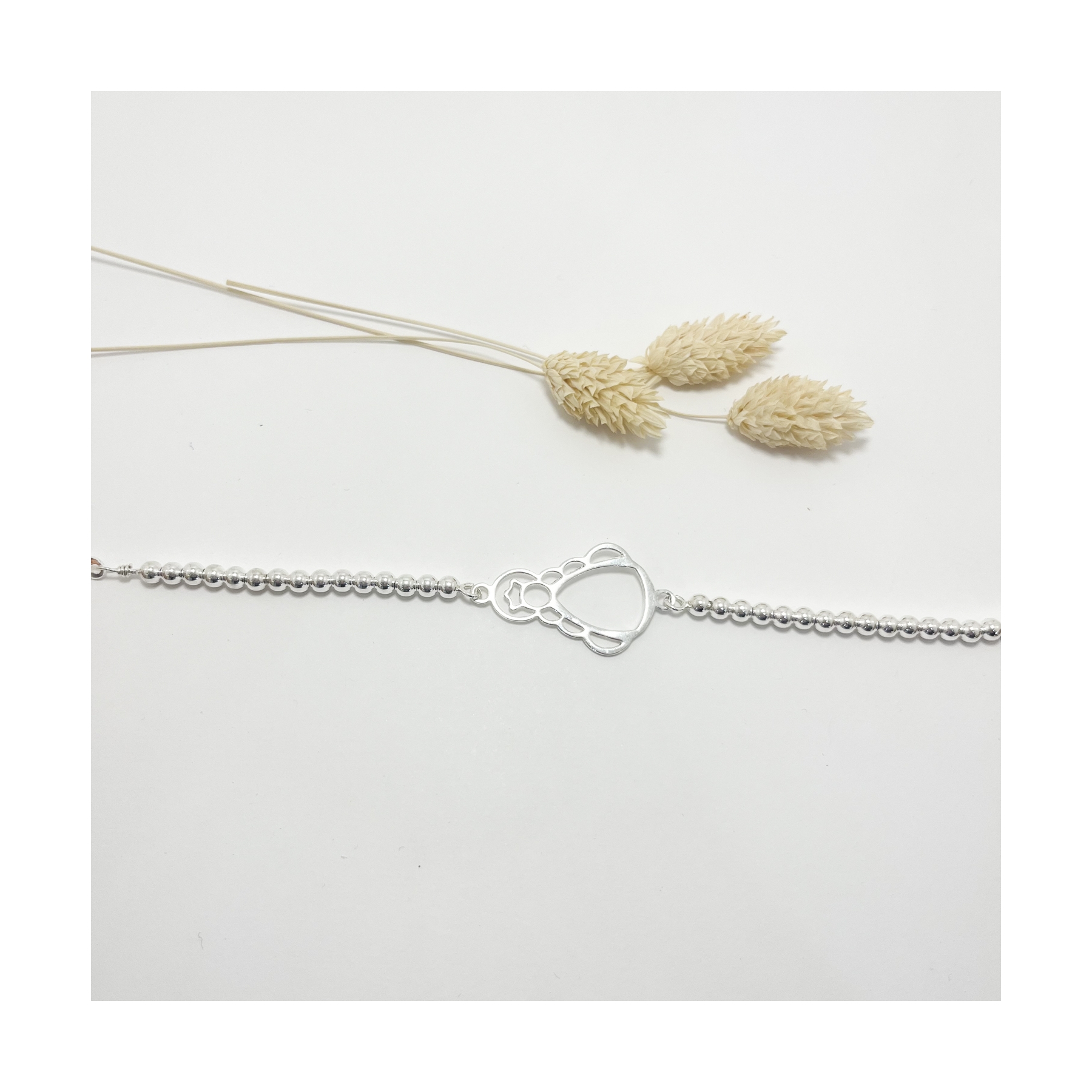 Pulsera tipo rosario con abalorio en el cierre de una cruz de plata de ley y en el centro de la silueta de la Virgen del Rocío de reina.